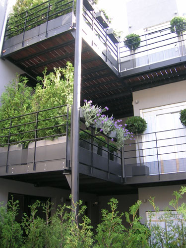 IMMEUBLES PROJETES ET TRANSFORMES ENTRE 2002 ET 2006. Immeuble situé dans la Commune d’Ixelles, Avenue de la Toison d’Or 10 / Rue de Stassart 19 à 1050 Bruxelles. Le propriétaire a acquis l’immeuble sur la Toison d’Or et la maison située rue de Stassart 19. Les 2 immeubles ont un mur arrière mitoyen. L’unification de 2 parcelles a permis la création d’un accès vers les logements via la rue de Stassart et l’installation d’une surface commerciale sur les 3 niveaux de la Toison d’Or. Le projet a une surface commerciale de 300 m2 et 5 logements, dont un reconstruit dans la maison Stassart. Il s’agit d’une reconstruction lourde. La première travée de 4 m de profondeur en façade avant a été démolie. Une nouvelle façade en béton architectonique a permis la création de terrasses. Une construction en acier – escalier, passerelles et terrasses – dans la cour intermédiaire donne accès aux logements.